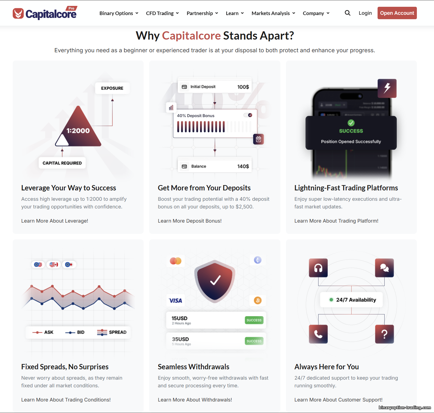 अन्य फीचर्स में One-Click मोड (बिना अतिरिक्त कन्फर्मेशन के तुरंत ऑर्डर प्लेस करना), Advanced Order सेक्शन (विस्तारित ऑर्डर सेटिंग्स—जैसे किसी खास प्राइस पर ट्रिगर होने वाला pending binary trade—यह दिलचस्प और अपेक्षाकृत दुर्लभ फ़ंक्शन है), साथ ही प्लेटफ़ॉर्म में इन-बिल्ट economic calendar और news feed शामिल हैं। यह भी उल्लेखनीय है कि CapitalCore कुछ अकाउंट टियर (आमतौर पर Gold और VIP जैसे ऊँचे) के लिए मुफ्त VPS सर्वर ऑफर करता है। VPS 24/7 स्थिर कनेक्शन बनाए रखने में मदद कर सकता है। उदाहरण के लिए, यदि आप लंबी अवधि के ट्रेड रखते हैं, रात में ट्रेड करते हैं या आपका इंटरनेट अस्थिर है, तो VPS क्रिटिकल समय पर डिसकनेक्शन का जोखिम घटा सकता है। भले ही MetaTrader robots यहाँ सपोर्ट नहीं होते, फिर भी स्थिरता के लिए VPS उपयोगी हो सकता है। VPS का एक्सेस आम तौर पर सपोर्ट के जरिए अनुरोध पर मिलता है और न्यूनतम जमा पर निर्भर हो सकता है (अन्य ब्रोकर्स की तरह संभवतः $1000–5000 रेंज)।