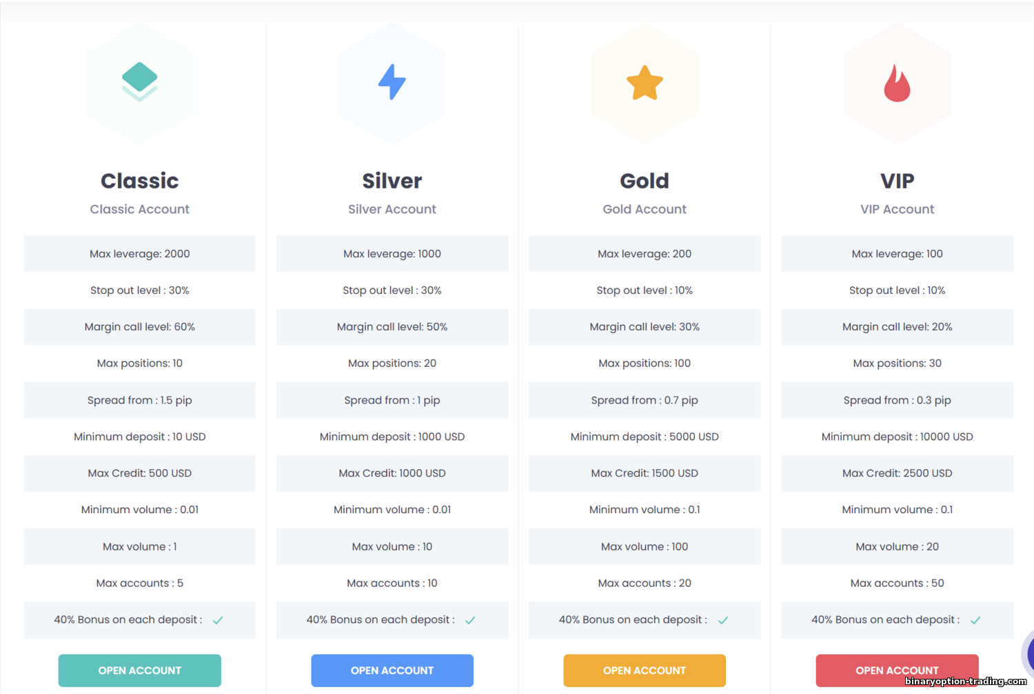 | Classic (standard) | $10 | $1 से $500 तक | 3 तक एक्सटेंशन | शुरुआती यूज़र्स के लिए एंट्री-लेवल, पूरी फ़ंक्शनैलिटी, स्वैप-फ्री, 1:2000 तक लीवरेज |