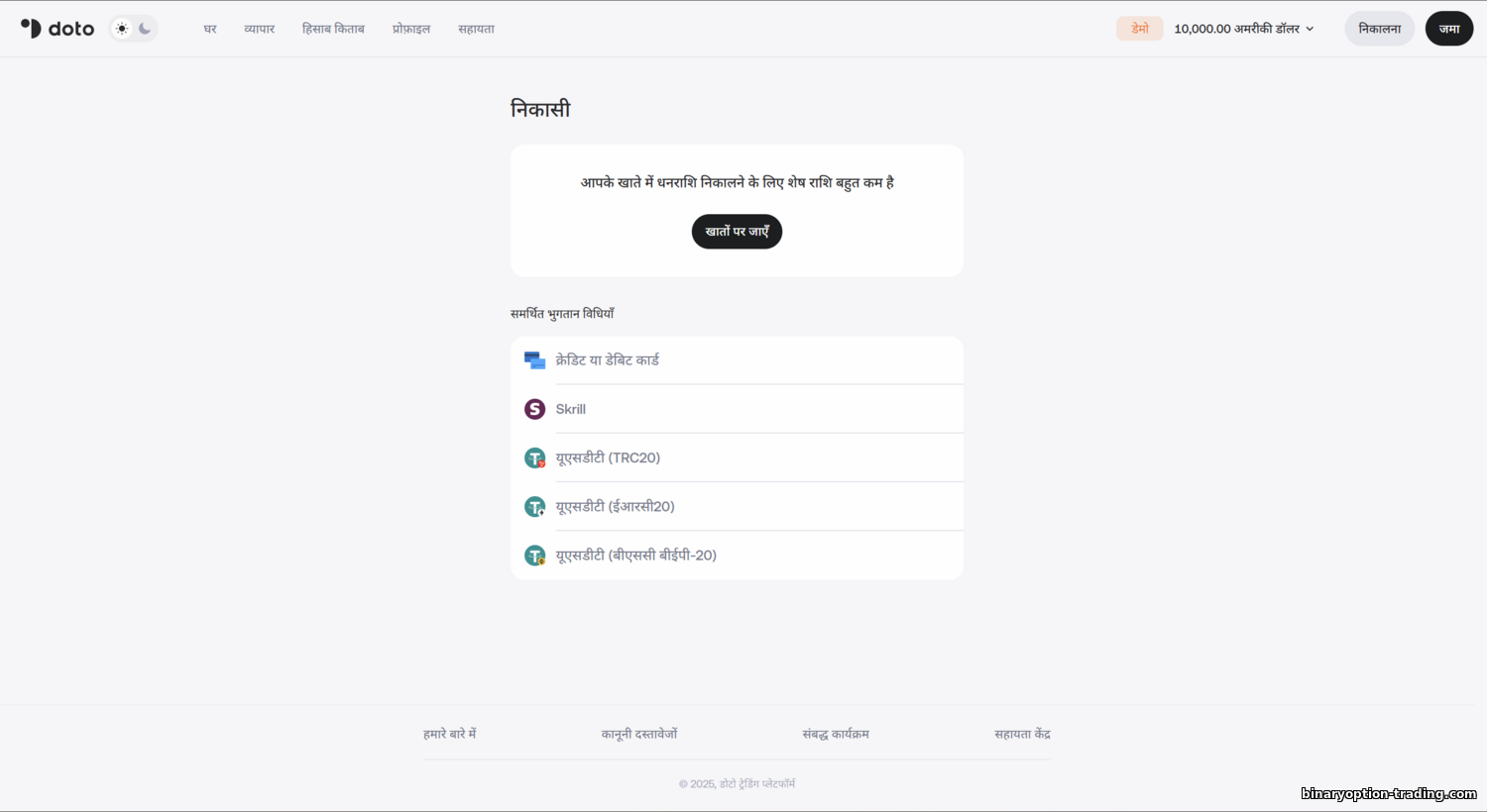 महत्वपूर्ण: Doto, अन्य रेगुलेटेड ब्रोकरों की तरह, मांग करता है कि फंडिंग और विदड्रॉ विधि आपके अपने नाम पर हो। अपने कार्ड/वॉलेट ही उपयोग करें—नाम आपके Doto प्रोफ़ाइल से मेल खाना चाहिए। इससे मनी-लॉन्ड्रिंग रोकी जाती है और धोखाधड़ी से सुरक्षा मिलती है।