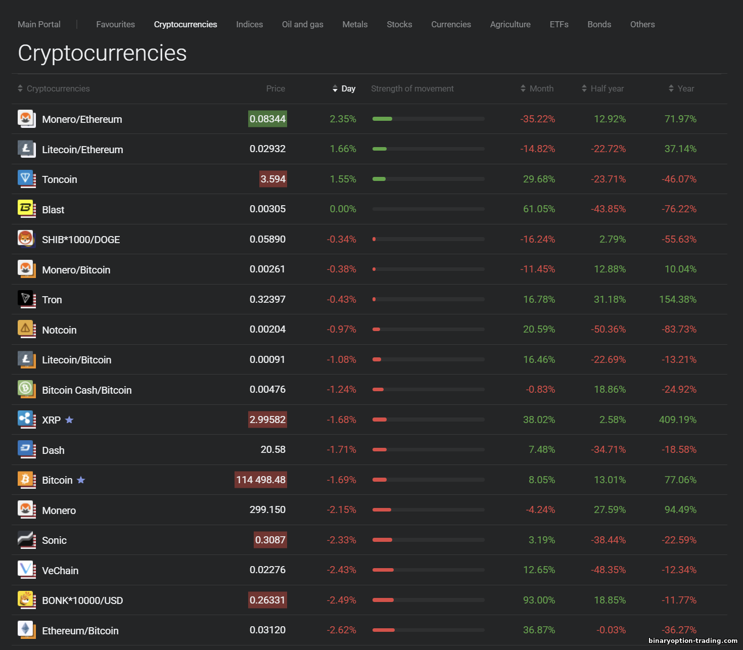 - क्रिप्टोकरेंसी: Forex Club क्रिप्टो‑CFDs देने वालों में शुरुआती रहा और अब ~40–46 इंस्ट्रूमेंट्स लिस्ट करता है। Bitcoin, Ethereum, Litecoin, Ripple, Bitcoin Cash समेत कई कॉइन्स और क्रिप्टो इंडेक्स। Libertex पर 24/7 ट्रेडिंग, सीमित लीवरेज (उच्च अस्थिरता के कारण अक्सर 1:5 तक)। क्रिप्टो‑CFDs पर स्वैप अपेक्षाकृत ऊँचे — लंबा होल्ड महँगा, इसलिए शॉर्ट‑टर्म रणनीतियों के अनुकूल। Libertex पर क्रिप्टो में स्प्रेड व्यावहारिक रूप से शून्य; कमीशन ~0.1–0.5% प्रति साइड। उदाहरण: BTC/USD ~0.5% — बहुत छोटा नहीं, पर स्लिपेज न्यूनतम और रिक्वोट नहीं।