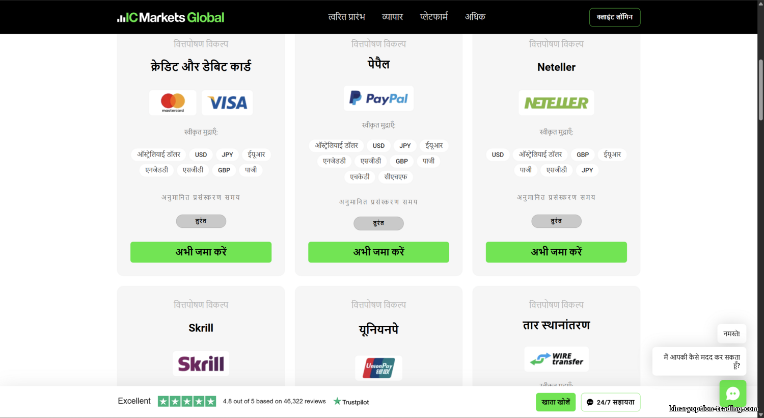 IC Markets डिपॉज़िट और अधिकांश विदड्रॉअल पर शुल्क नहीं लेता। जो राशि भेजते हैं वही क्रेडिट होती है (पेमेंट‑प्रोवाइडर फीस ब्रोकर कवर करता है)। कार्ड/ई‑वॉलेट (Skrill, Neteller, PayPal आदि) पर भी 0%। कई ब्रोकर $10–30 लेते हैं — यहाँ नहीं।