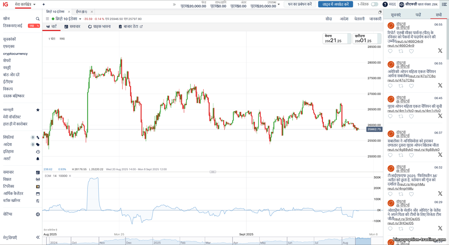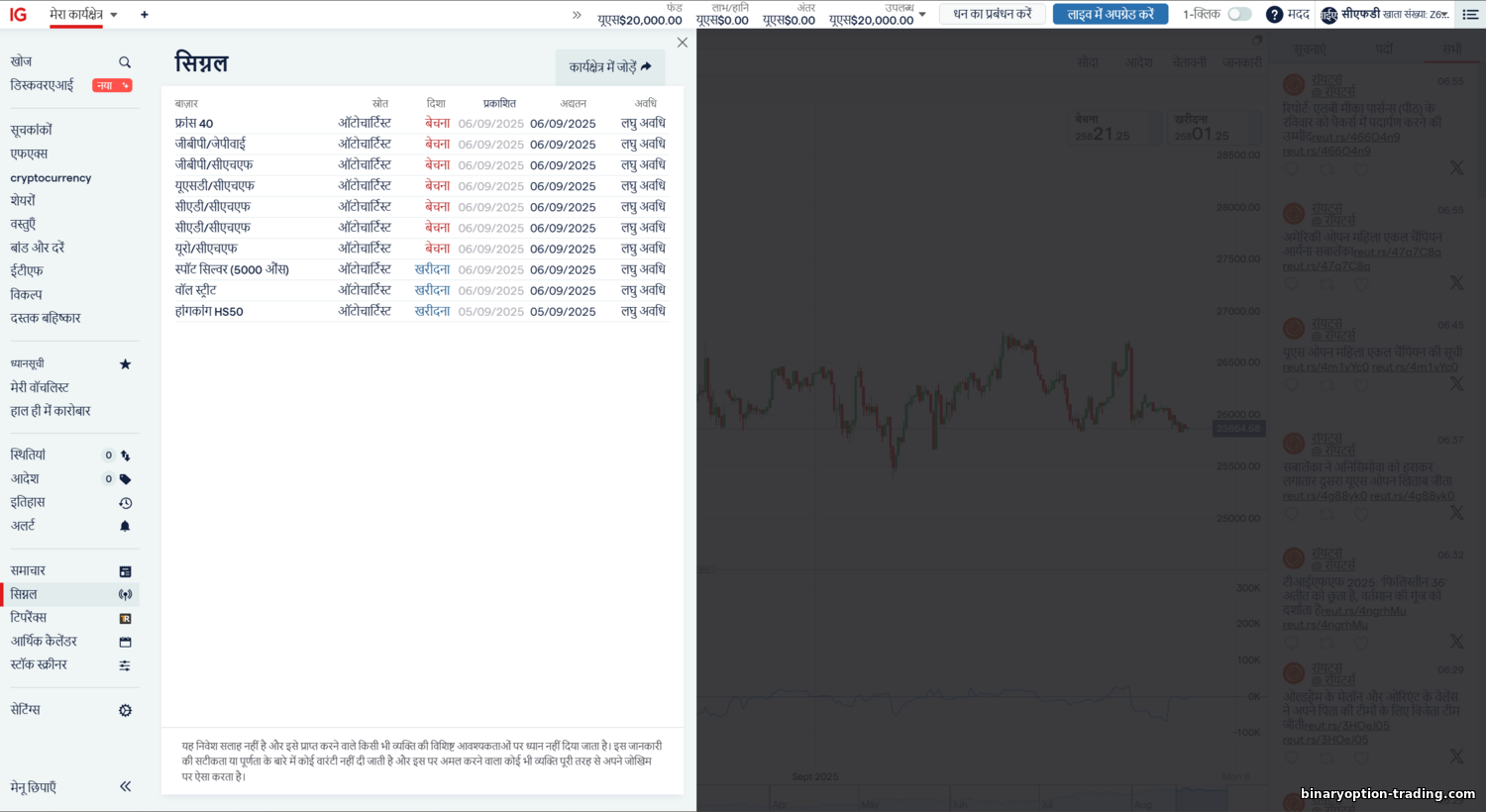 IG किसलिए जाना जाता है और क्या ऑफर करता है? IG ने फाइनेंशियल स्प्रेड बेटिंग की नींव रखी — 1970 के दशक में, जब सोना रखना प्रतिबंधित था, इसने क्लाइंट्स को गोल्ड की कीमतों पर सट्टा लगाने की सुविधा दी। आज IG एक मल्टी-एसेट ऑनलाइन ब्रोकर है। प्रोडक्ट लाइन में Forex और CFDs सभी प्रमुख एसेट क्लासेस (करेंसीज़, शेयर, इंडाइसेज़, कमोडिटीज़, क्रिप्टो आदि), कुछ देशों में वास्तविक शेयर और ETF तक पहुँच, ऑप्शंस और इन-हाउस इनोवेटिव इंस्ट्रूमेंट्स शामिल हैं। उदाहरण के लिए, IG ने Turbo24 बनाया — दुनिया का पहला एक्सचेंज-ट्रेडेड टर्बो वारंट जो 24 घंटे, 5 दिन उपलब्ध रहता है। Turbo24 यूरोपीय ट्रेडर्स को एक नॉकआउट (बैरियर) सेट करने देता है जो जोखिम सीमित करता है और प्रभावी लीवरेज तय करता है। IG FX, इंडाइसेज़ और कमोडिटीज़ पर वैनिला और बैरियर ऑप्शंस भी देता है — जो कई यूरोपीय देशों में उपलब्ध हैं। UK और आयरलैंड में, IG पारंपरिक रूप से फाइनेंशियल स्प्रेड बेटिंग प्रदान करता है — टैक्स-इफ़िशिएंट अंदाज़ जो UK ट्रेडर्स में लोकप्रिय है।