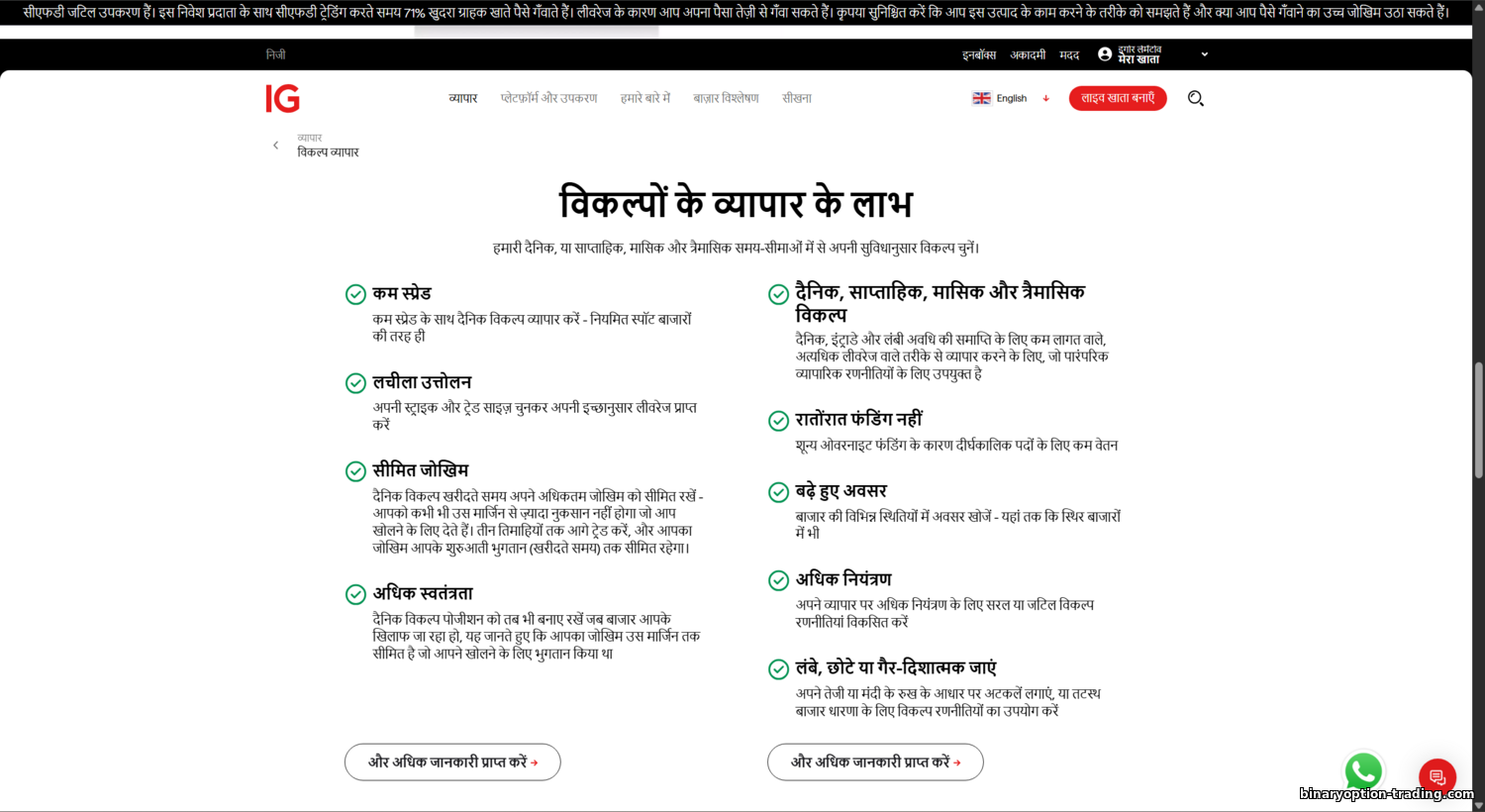 IG ऑप्शंस के लिए विस्तृत शिक्षा देता है, जिनमें वीडियो और डेमो मोड शामिल हैं। Sprint Markets (अल्ट्रा-शॉर्ट 60-सेकंड बायनरीज़) जो IG पहले देता था, ESMA नियमों के कारण अब उपलब्ध नहीं। IG अब Turbo24 और नॉक-आउट्स पर फ़ोकस करता है।
