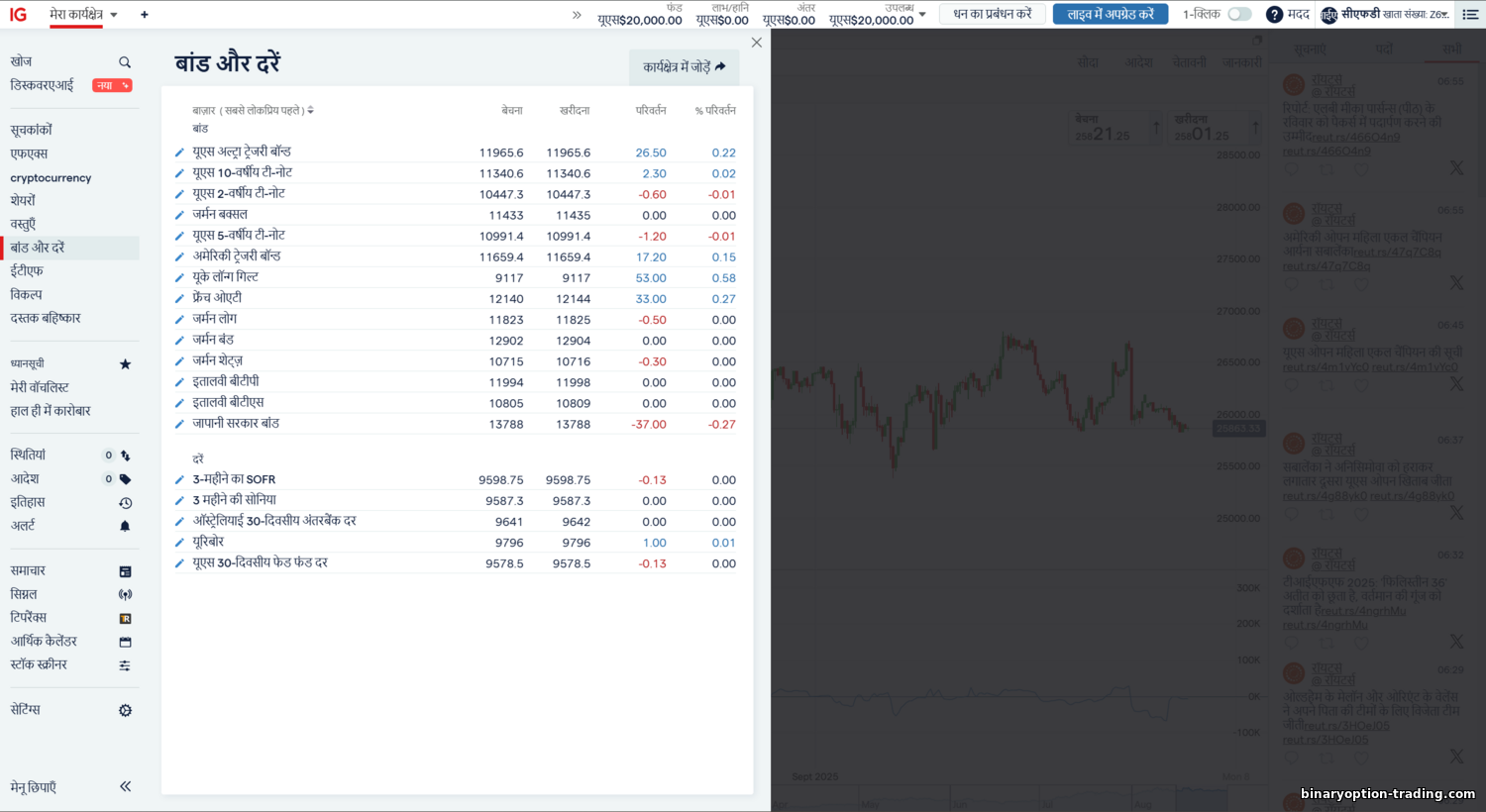 IG सरकारी बॉन्ड फ्यूचर्स पर भी CFDs लिस्ट करता है: US Treasuries, German Bunds, UK Gilts, Japanese JGBs और अन्य (~दर्जनभर इंस्ट्रूमेंट्स)। उदाहरण के लिए, आप US 10-वर्षीय यील्ड्स घटने (बॉन्ड प्राइस बढ़ने) पर पोज़िशन ले सकते हैं। सामान्य लीवरेज ~1:10 है। ये निच, पर मैक्रो ट्रेड्स और हेजिंग में उपयोगी हैं। IG इंटरेस्ट-रेट मार्केट्स (सेंट्रल बैंक आउटकम्स) भी देता है जहाँ आप नीति फैसलों (जैसे Fed/ECB रेट मूव्स) पर सट्टा लगा सकते हैं।