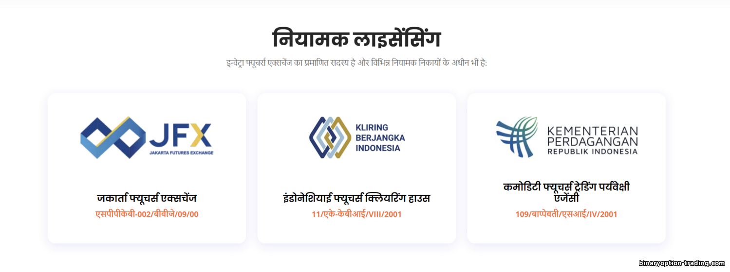 Invetra कहता है कि वह इंडोनेशिया में पूर्ण रूप से लाइसेंस प्राप्त और रेगुलेटेड है। निगरानी BAPPEBTI—इंडोनेशिया की Commodity Futures Trading Authority (डेरिवेटिव्स मार्केट की सरकारी निगरानी संस्था) करती है। Invetra के पास BAPPEBTI प्राधिकरण है: सार्वजनिक स्रोतों के अनुसार No. 109/BAPPEBTI/SI/IV/2001। नंबर अप्रैल 2001 का संकेत देता है। जैसा बताया, यह मूल रूप से Jalatama Artha Berjangka (Invetra का पूर्ववर्ती) को जारी किया गया था। 2024 में नाम बदलने पर लाइसेंस प्रभावी रूप से PT Invetra Teknologi Berjangka पर पुनः दर्ज हुआ।