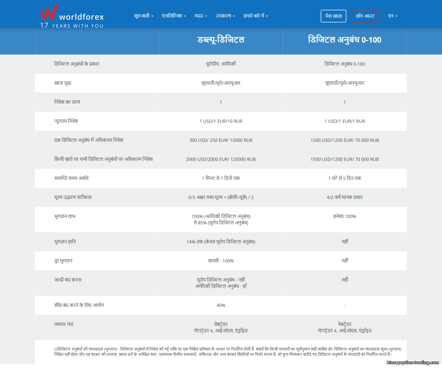 एक विशिष्ट ऑफ़र डिजिटल कॉन्ट्रैक्ट — बाइनरी ऑप्शंस — है, अलग W-DIGITAL अकाउंट पर। FX ब्रोकरों में यह दुर्लभ है; World Forex ने 2010 के शुरुआती दशक में इसे पेश किया। काम करने का तरीका: