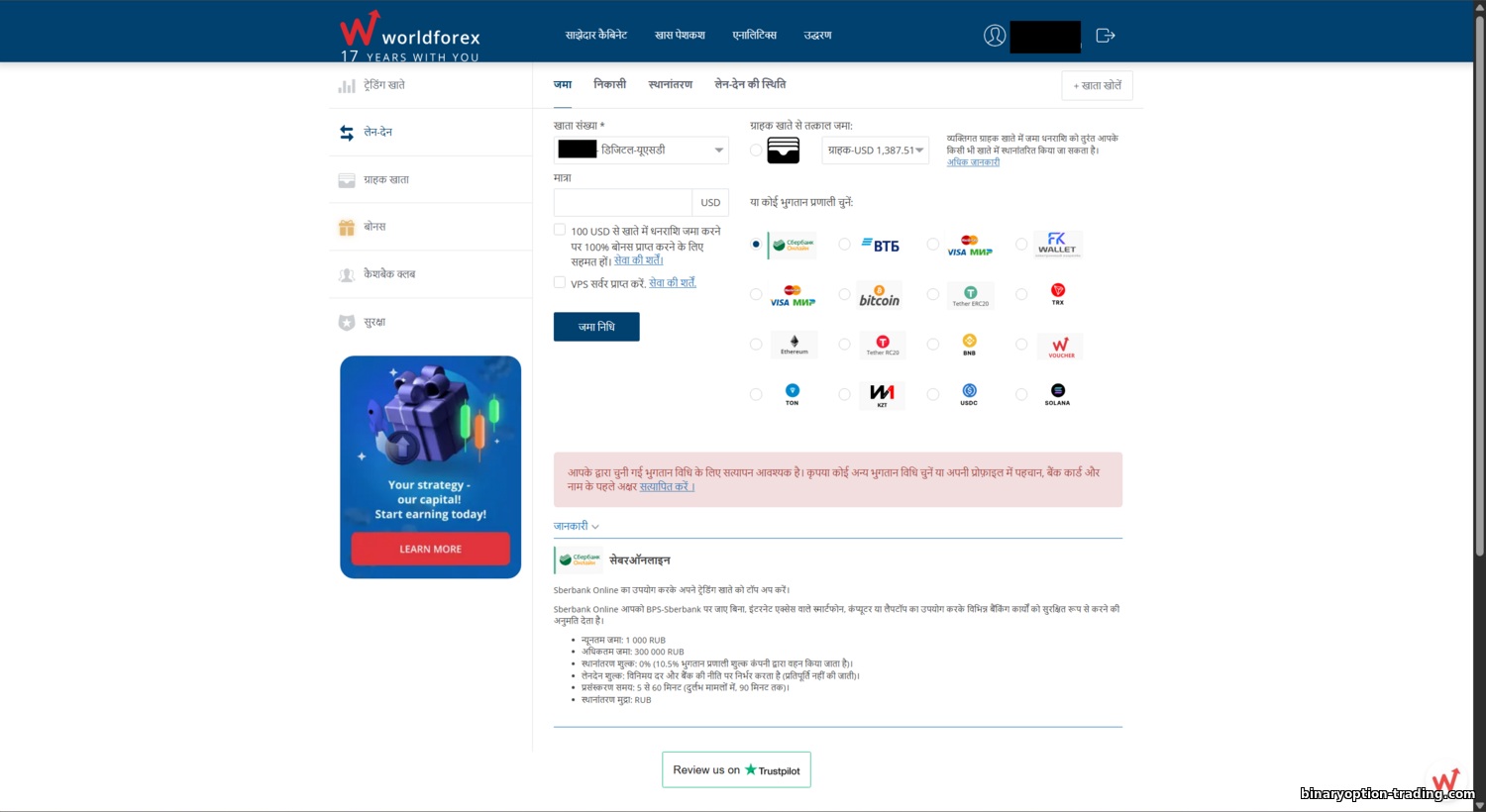 - बोनस व प्रमो। डिपॉज़िट बोनस (जैसे +100% — नीचे विवरण) सक्रिय करें और मौजूदा प्रमो देखें। यहाँ प्रोमो कोड भी दर्ज करें।