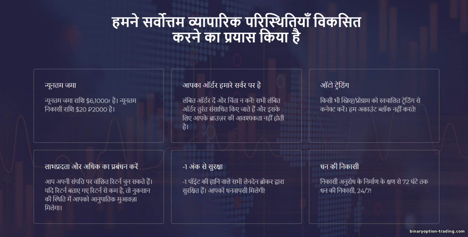 ट्रेडिंग कंडीशंस किसी भी ब्रोकर की अपील तय करने में प्रमुख होती हैं। UTE Limited के मामले में ये बाइनरी ऑप्शंस बाजार के लिए सामान्य हैं, पर कुछ असामान्य बातें भी हैं। मुख्य पैरामीटर्स पर नज़र डालें: