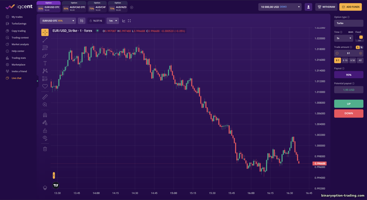 - लर्निंग और सपोर्ट के मामले में Binomo क्या देता है? — शुरुआती लोगों को इंटरैक्टिव ट्यूटोरियल मिलता है, जो मूल ट्रेडिंग कॉन्सेप्ट समझाता है। साइट पर रणनीतियों का सेक्शन और FAQ भी है। हर नए Binomo क्लाइंट को बिना जोखिम अभ्यास के लिए $10 000 का डेमो अकाउंट मिलता है। सपोर्ट 24/7 काम करता है और चैट व ईमेल के जरिए—रूसी में—तेज़ी और शालीनता से जवाब देता है।