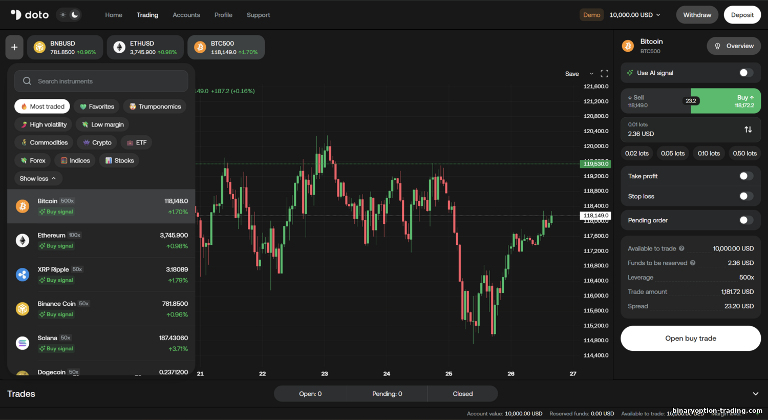 - Doto – नया, तेजी से बढ़ता ब्रोकर जिसे पहले ही अवॉर्ड मिले हैं (उदाहरण: “Best CFD Broker 2025”). कई जुरिस्डिक्शन्स में रेगुलेटेड (CySEC, FSCA आदि), MT4/MT5 और TradingView इंटीग्रेशन के साथ अपना प्लेटफ़ॉर्म देता है। फायदे: कम एंट्री ($15), व्यापक मार्केट रेंज (Forex, स्टॉक्स, कमोडिटीज़, ETFs, क्रिप्टो CFDs)। कमियाँ: सेंट अकाउंट नहीं और लंबे समय की निष्क्रियता पर संभावित शुल्क।
