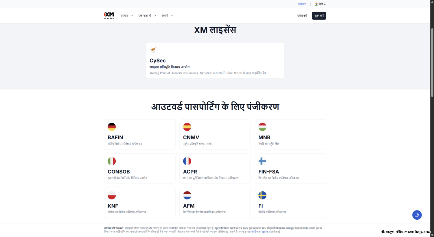 - IFSC (Belize) — International Financial Services Commission (XM Global Limited के लिए लाइसेंस नंबर IFSC/60/354/TS/19)। यह ऑफ़शोर नियामक (वर्गीकरण से Tier‑3) है जो आधारभूत पर्यवेक्षण प्रदान करता है। इसके माध्यम से XM उन देशों को सेवा देता है जहाँ अधिक लचीली शर्तें (उच्च लेवरेज, बोनस) आवश्यक हैं।