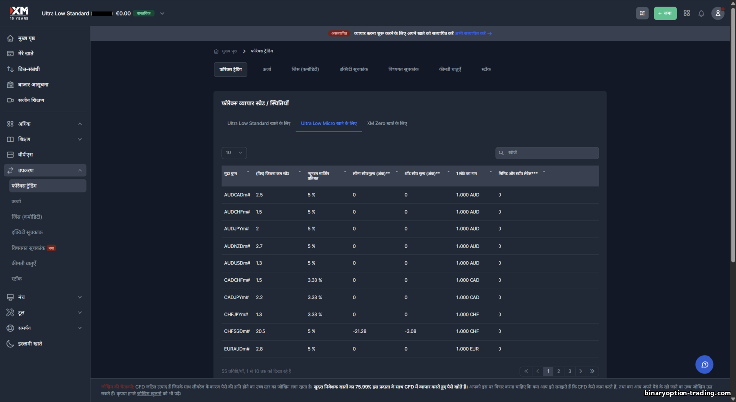 - Forex (करंसी): XM की मुख्य विशेषज्ञता। ब्रोकर 57 करंसी पेयर्स सूचीबद्ध करता है, जिनमें सभी मेजर्स — EUR/USD, GBP/USD, USD/JPY, USD/CHF, USD/CAD, AUD/USD, NZD/USD — के साथ माइनर्स व कुछ एक्सॉटिक शामिल हैं। उदाहरण: EUR/GBP, EUR/JPY, GBP/JPY, CAD/JPY; दुर्लभ पेयर्स: USD/ZAR, SGD/JPY, यहाँ तक कि USD/RUB। स्प्रेड ऊपर कवर हैं: EUR/USD ~0.8 पिप्स (UL) / ~1.6 पिप्स (Std), अन्य मेजर्स पर थोड़ा अधिक। फोरेक्स पर सबसे उच्च लेवरेज — 1:1000 (नॉन‑EU) — मिलता है। लेवरेज का ज़िम्मेदारी से उपयोग करें: कई नए ट्रेडर्स अधिक उपयोग से Margin Call तक पहुँच जाते हैं; XM अपने वेबिनार में रिस्क मैनेजमेंट सिखाता है।