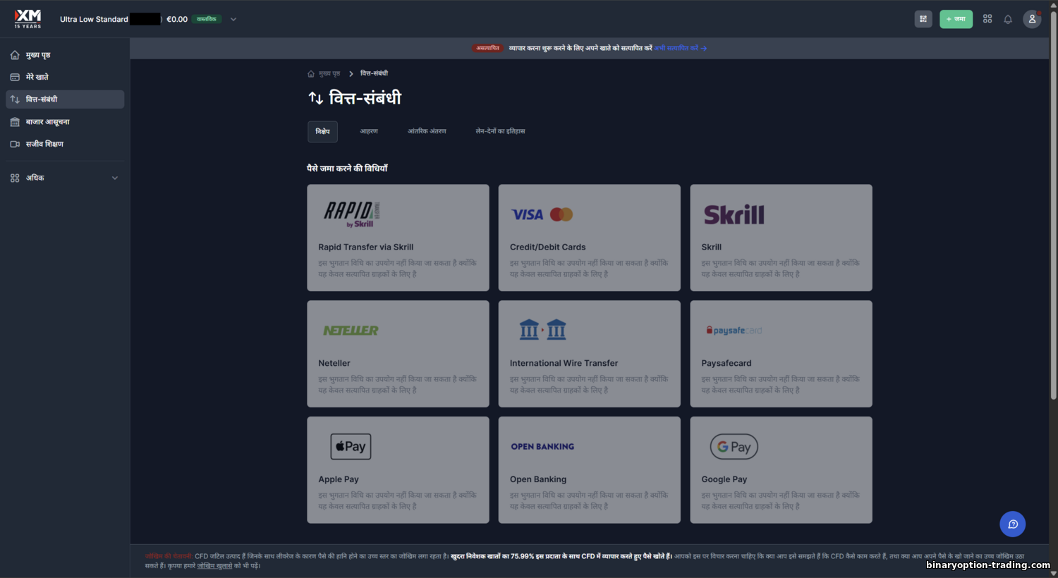 - क्रिप्टो — XM क्रिप्टो जमा/निकासी स्वीकार नहीं करता; केवल फ़िएट।